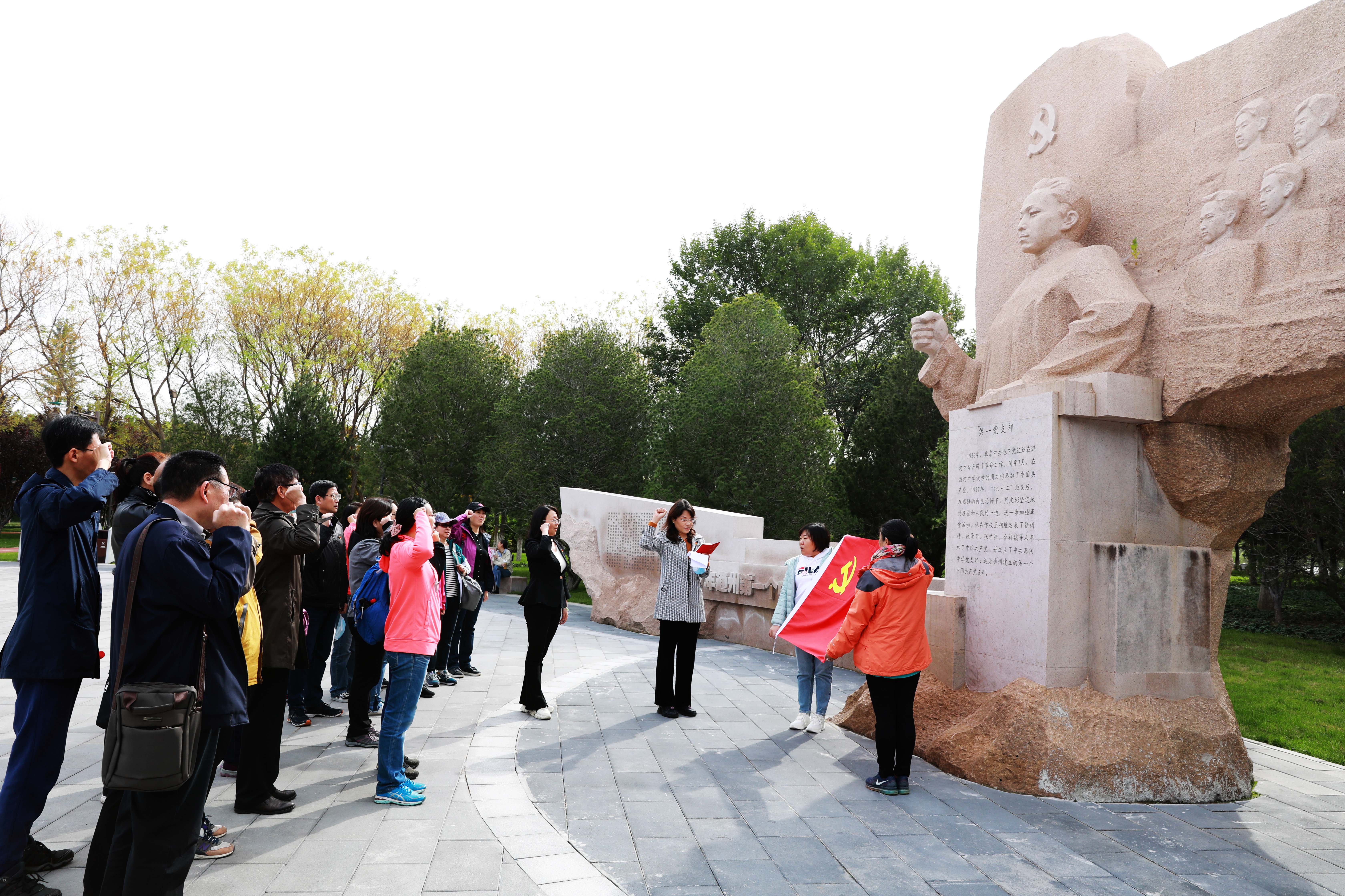 在通州第一党支部雕塑前,举行了新党员入党宣誓和党员重温入党誓词活动。