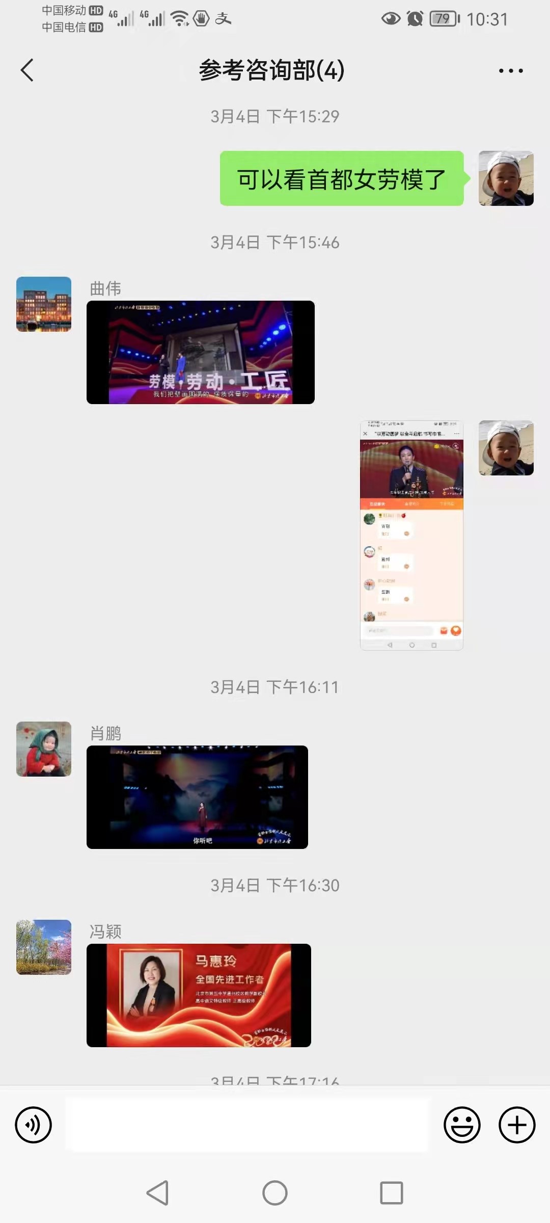 馆员们在线观看了“首都女劳模风采展示”活动,学习女劳模在各行各业中展现的巾帼担当,唱响“以劳动圆梦,以奋斗起航,书写巾帼华章”主旋律。通过活动馆员纷纷表示:榜样的力量激励了图书馆馆员争做最美新时代的奋斗者,展现新时代巾帼风采。