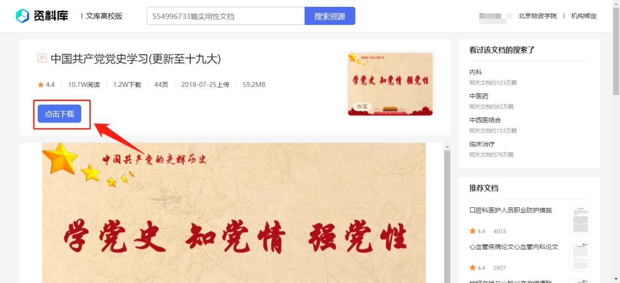 6. 百度文库高校版下所有文档都可以实现全文浏览和直接下载,选择所需文档进入浏览,在标题下有“点击下载”按钮,点击下载。