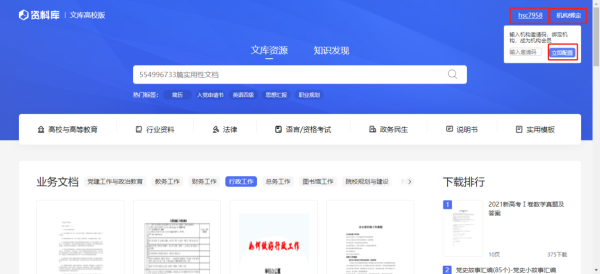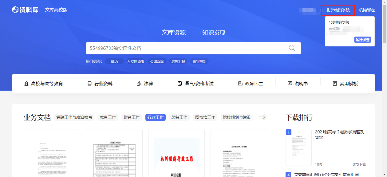 4. 验证成功后即可在校外通过百度账号访问eduai.baidu.com(百度文库高校版)下载资源。(验证成功后会出现所绑定学校的名称和解除绑定按钮)