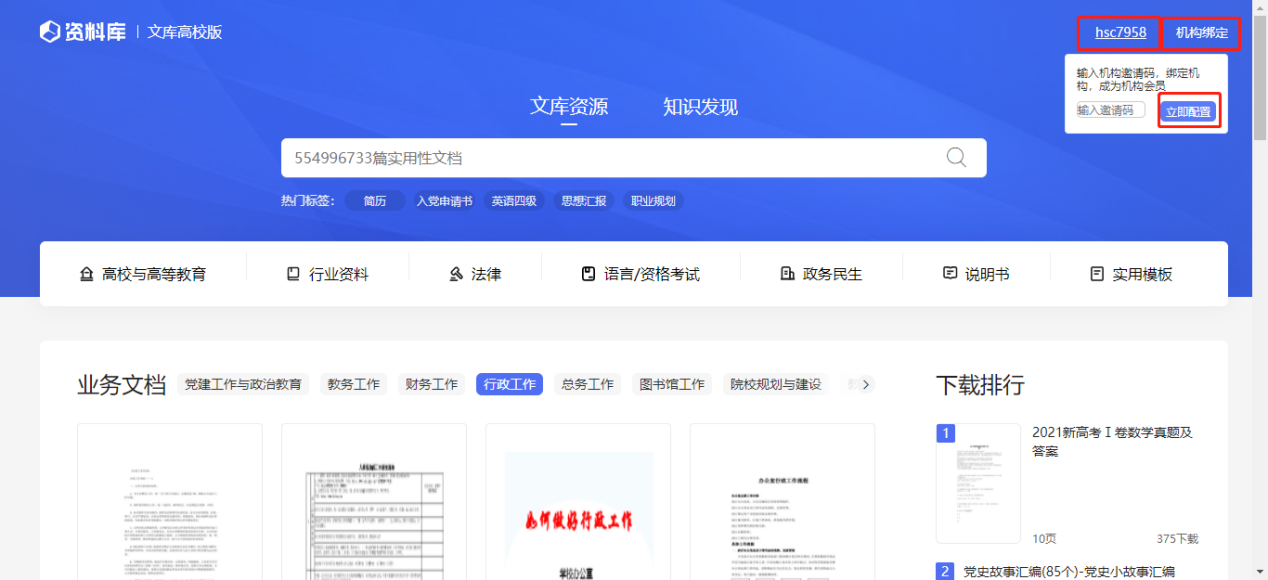 3. 登录成功后,页面右上角的登录按钮将变成用户个人信息,鼠标放在机构绑定上,会浮出下拉框,在校IP内,输入邀请码(mUJ1tDaw)点击“立即配置”按钮 即可完成绑定。