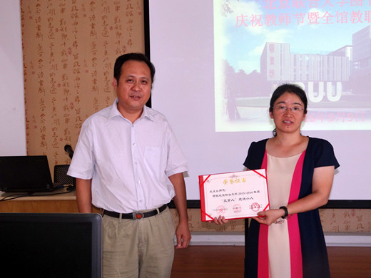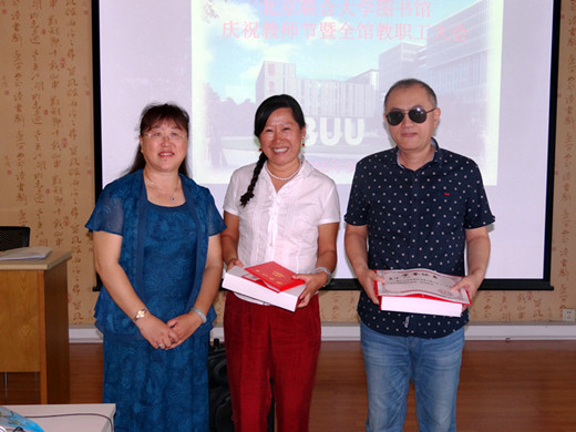 馆长王彤为获得北京市教育工会从事教育事业30年表彰的吕秀清、盛强颁发了荣誉证书和纪念品;党总支书记翟金忠为获得2015—2016年度校“三育人”先进个人的赵庆龄颁发了荣誉证书; 副馆长王建远、李九丽、汪明骏为获得校图书馆2015—2016年度“三育人”先进个人的六位同志颁发了荣誉证书。