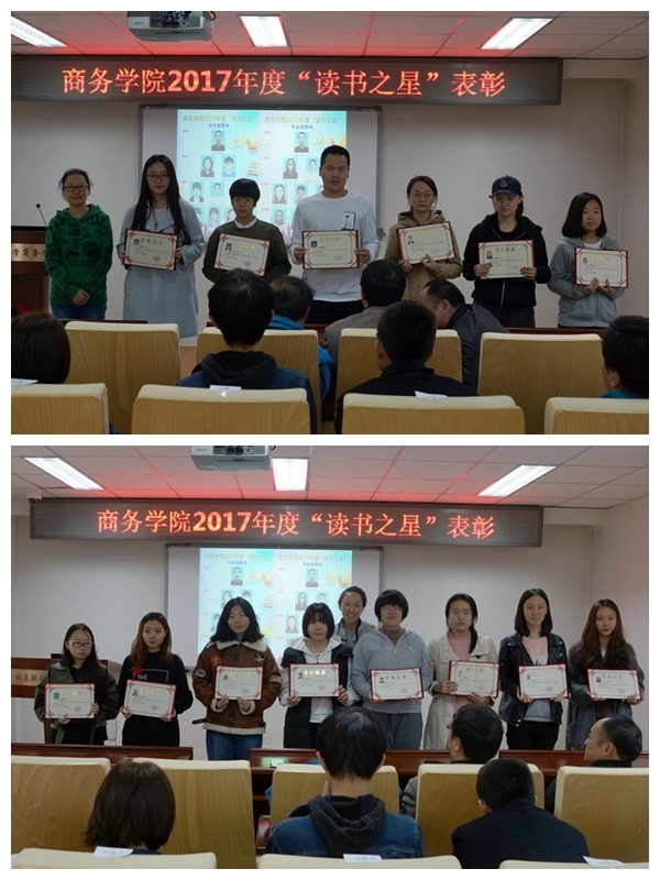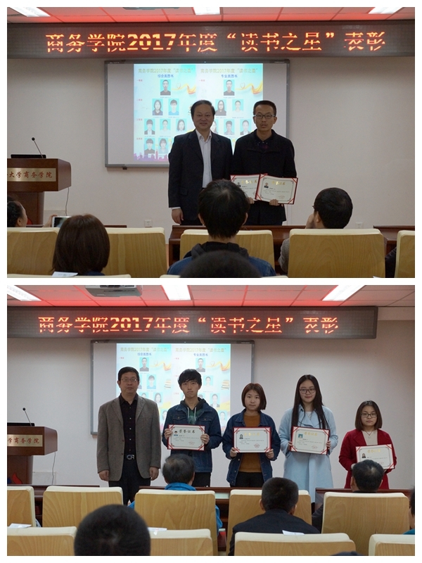 2017年10月31日,第七届(2017年度)“读书之星”表彰活动在商务学院报告厅举行。部分在校商务学院领导,有关职能部门领导,图书馆部分领导,馆员及全体获奖学生参加了此次活动。