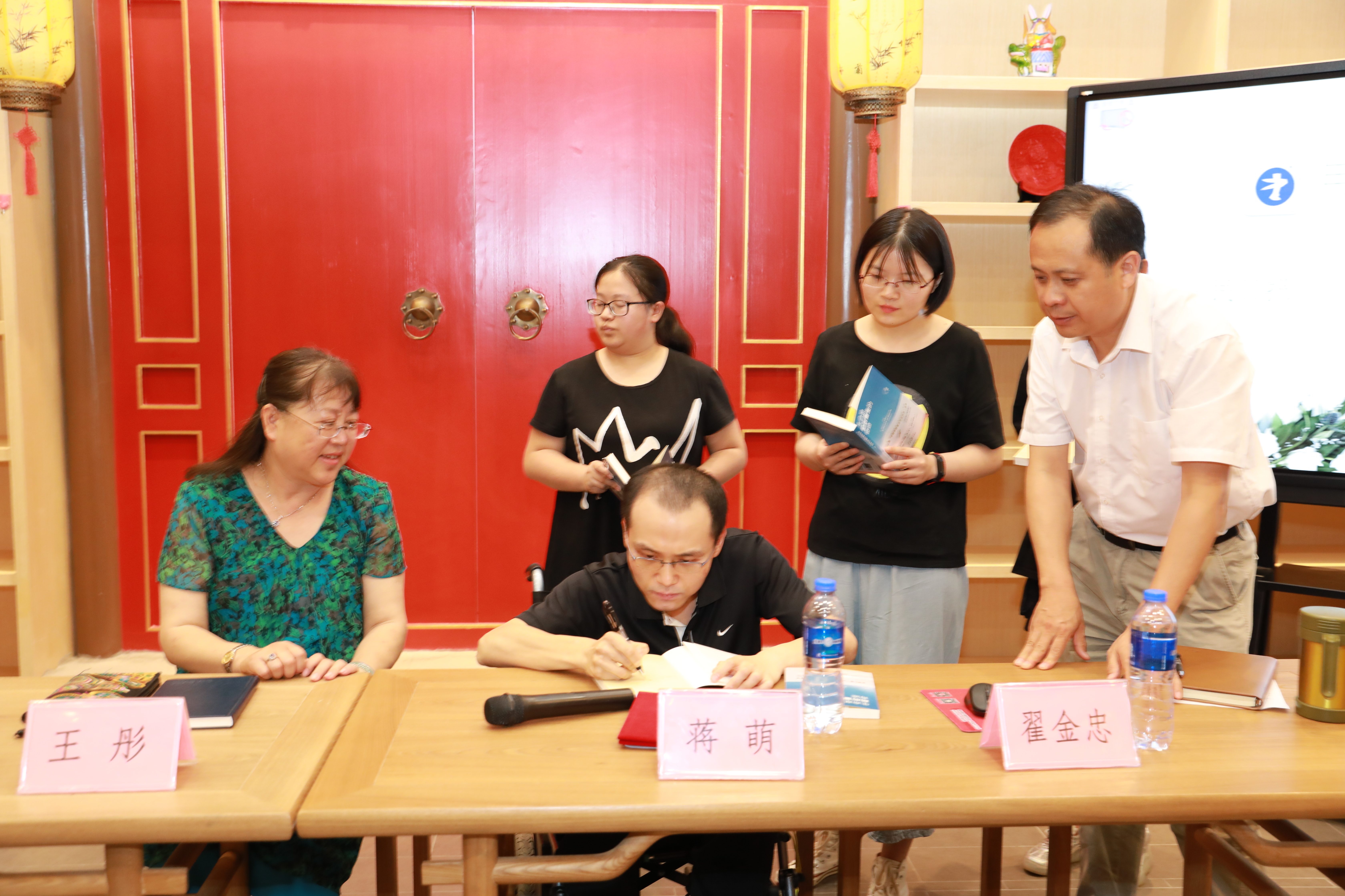 活动接近尾声,图书馆为参与互动同学准备了刚刚出版的蒋萌自传《生命是劫后重生的奇迹》,蒋萌在新书的扉页签名并与与会的师生合影留念。