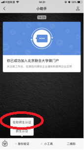 关注企业号后,进入小助手进行身份验证。选择“身份验证”中“在校师生认证”。输入本人学号、统一门户平台密码、与微信关联的手机号进行绑定。