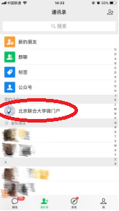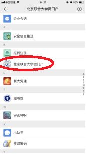 在微信通讯录“我的企业”中找到“北京联合大学微门户”。点击进入后,继续点击“北京联合大学微门户”。进入“我的图书”。