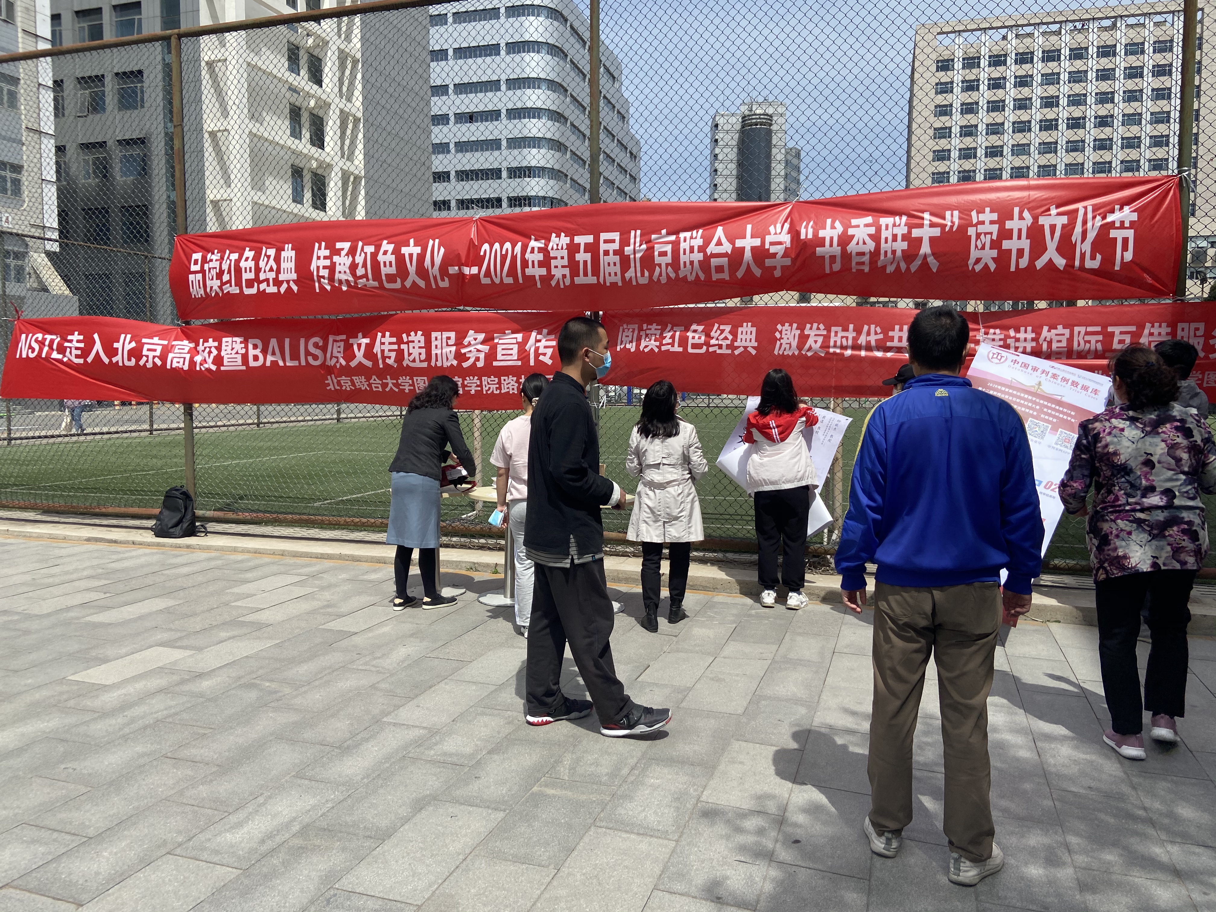 在我校品味经典——2021年第五届“书香联大”读书文化节启动仪式后,4月28日中午,图书馆学院路校区分部在应用文理学院开启读书文化节活动。本次现场宣传活动内容包括“品读红色经典、传承红色文化主题”推广活动、原文传递、馆际互借、数据库宣传等。馆长助理聂延平组织馆员及勤工俭学学生在学院主操场悬挂宣传横幅,放置海报,营造宣传氛围。