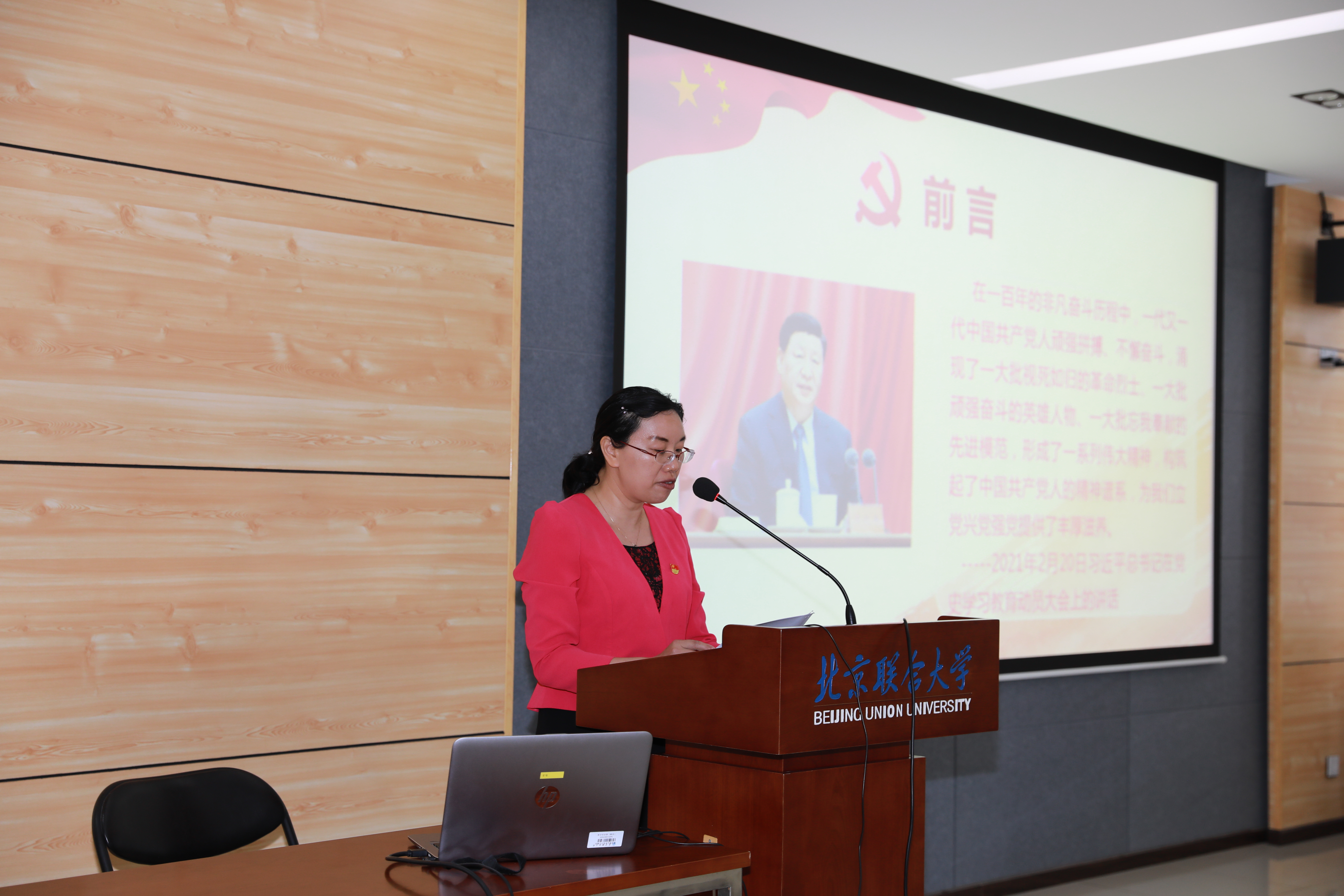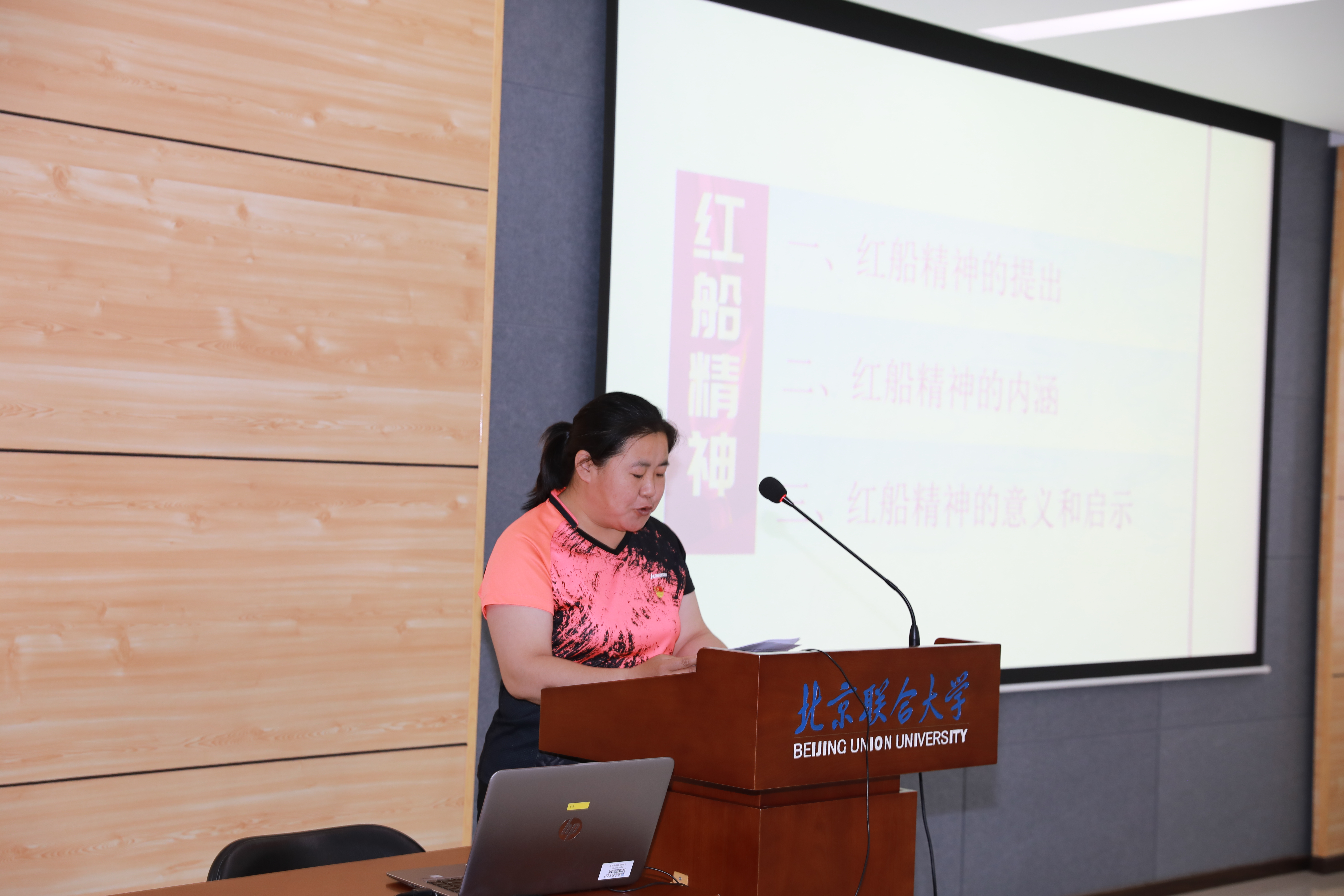 图书馆第一党支部书记齐秀霞以“弘扬红船精神 汲取奋进力量”为题进行了宣讲。她通过分析“红船精神”的形成与发展,阐述了共产党人为国为民、敢于担当的高尚情怀,勇于实践、艰苦奋斗的优秀品质,不畏牺牲的崇高境界。