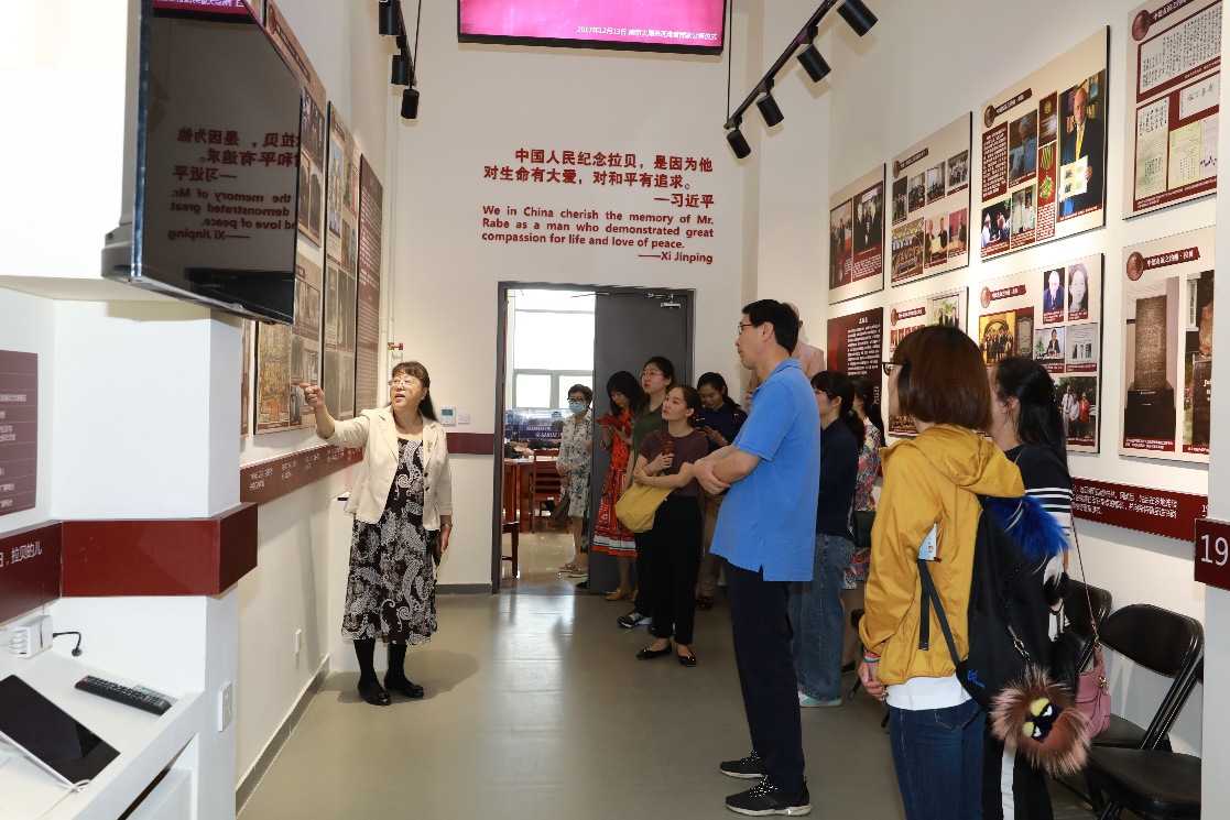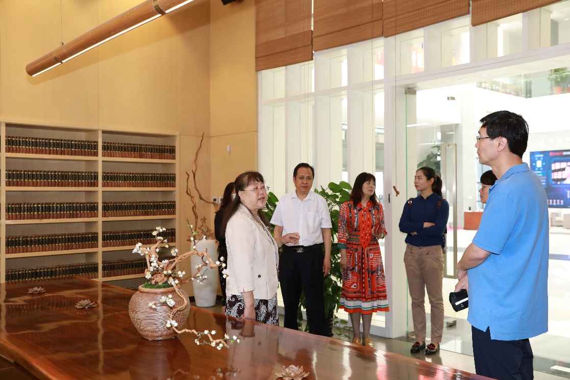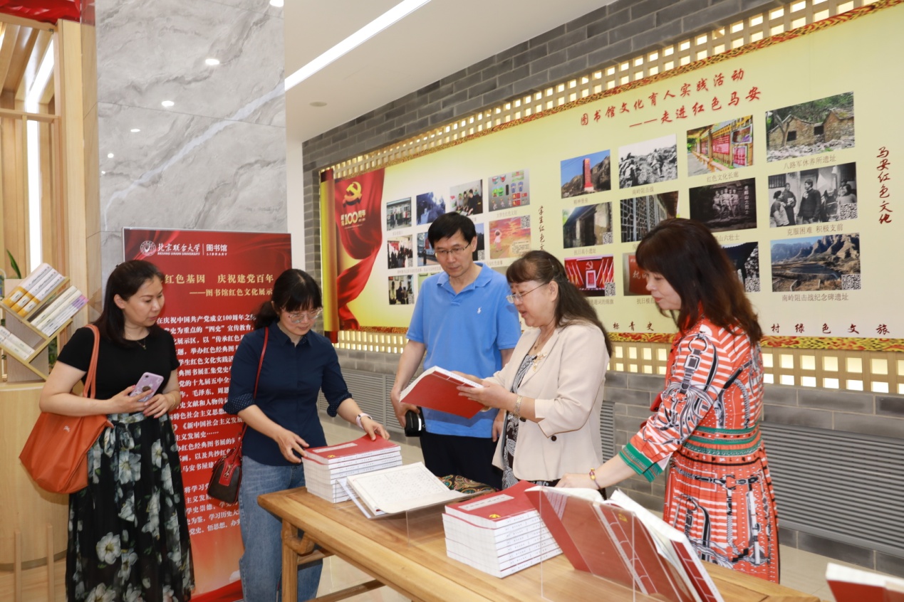 馆长纪峰一行参观考察了我校图书馆人文馆的文化艺术墙、藏书阁、元堃书院、约翰?拉贝北京交流中心、数字化自主学习中心,以及理工与艺术馆的红色文化展示区、电子阅览室、多功能视听室、观影室、联大文库、教师研修中心。在参观考察过程中,馆长王彤介绍了我馆新馆建设与老馆空间改造后的布局、功能及读书文化氛围的营造,以及自助借还、自助文印、朗读亭、静音仓等自助服务设施建设与预约服务功能的实施。介绍了围绕党史学习教育举办红色经典图书展、红色报展、红色经典连环画展,以及红色图书海报设计、共抄红色经典、走进红色马安等红色文化实践活动作品展示的情况。