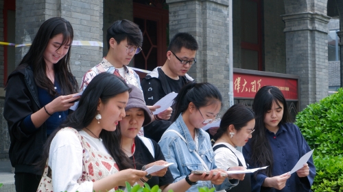 5月9日,在两校图书馆老师的带领下,两校大学生读书协会的30余名学生代表共赴北大红楼,踏上“走读党史 游学京华”的红色文化之旅。在一天的游学活动中,师生参观游览了以北大红楼为中心的红色革命景点,包括中法大学旧址、京师大学堂建筑遗存、毛泽东来京早期居住地——三眼井胡同、陈独秀旧居、中共早期刊物《向导》编辑部所在地、我党第一名女党员缪伯英同志居住所在地等。同学们按照事先准备好的游学任务在上述红色景点前展开了各种纪念活动,通过集体诵读、个人讲解、评说等方式进一步深化了红色革命历史的学习,同时也更深入地领悟了革命先驱们的精神思想。