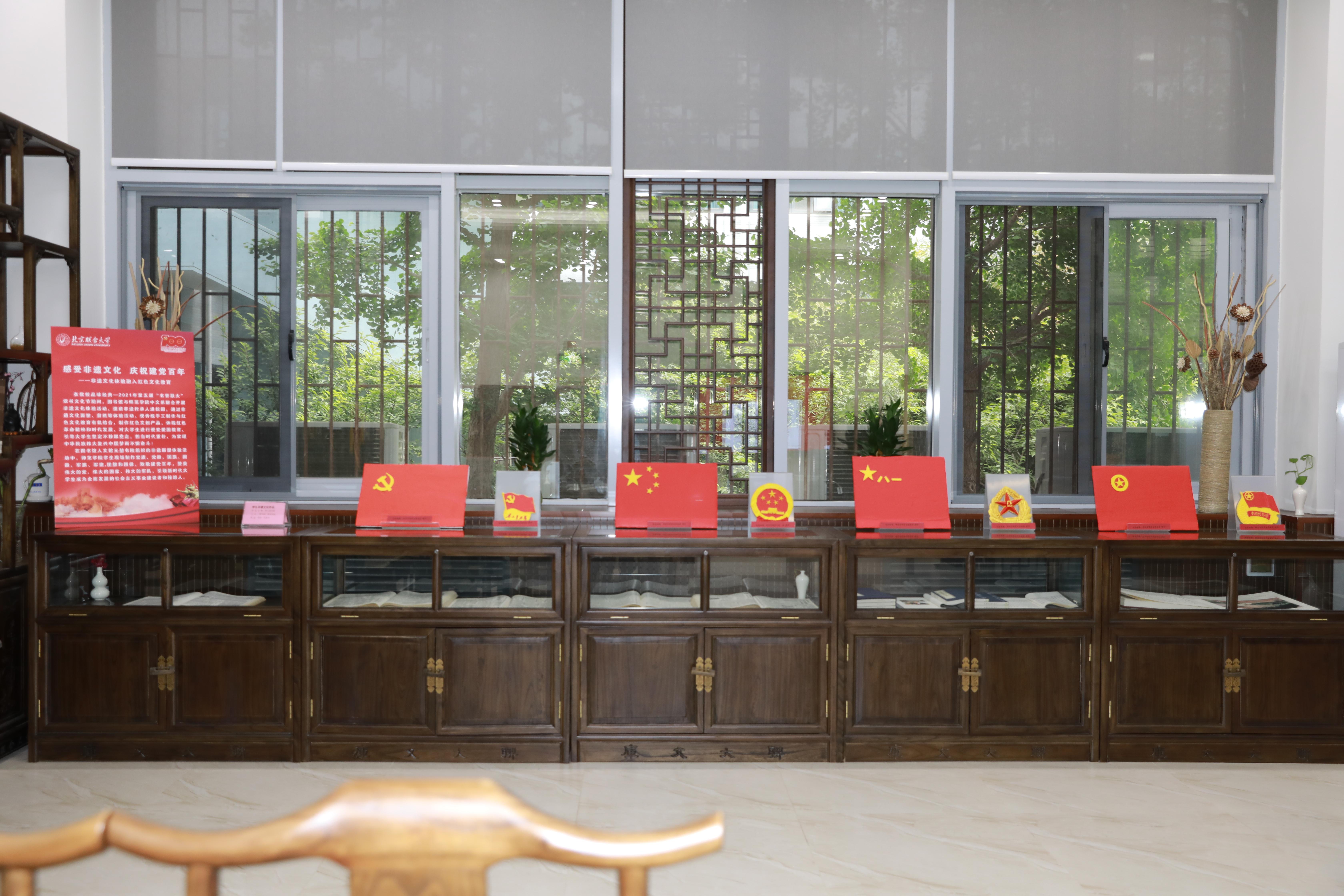 在现场制作的基础上,由图书馆、师范学院主办,师范学院教师贾真光策划、指导的“伟大的历程”学生非遗文化作品在图书馆进行了展示,展出了非遗面塑体验活动中学生制作的党旗、党徽,国旗、国徽,军旗、军徽,团旗和团徽,以及反映改革开放的剪纸作品,致敬建党百年,赞美伟大的党、伟大的国家、伟大的军队,讴歌改革开放,引领新时代大学生成为全面发展的社会主义事业建设者和接班人。