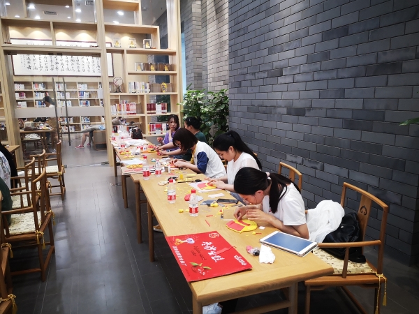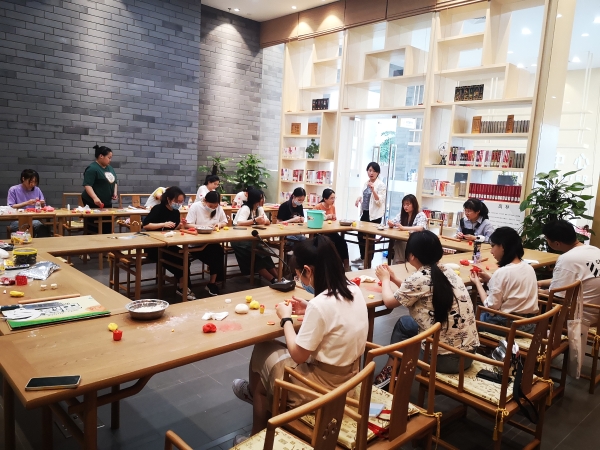 在我校品味经典——2021年第五届“书香联大”读书文化节期间,图书馆与师范学院中文系联合开展非遗文化体验活动,邀请非遗传承人进校园,通过非遗文化面塑、剪纸等体验活动,使传统手工制作与红色文化教育有机结合,制作红色文创产品,体现红色革命精神和时代发展,对大学生进行爱党爱国教育。
