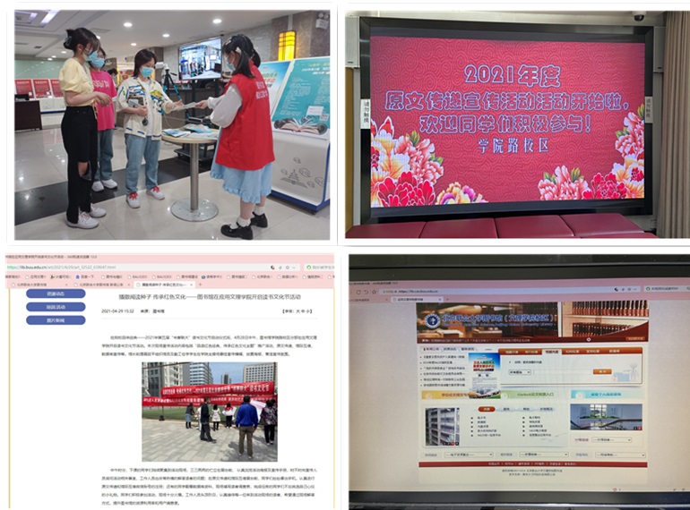 在宣传月期间,图书馆充分利用馆内和校内宣传途径广泛进行宣传,如在图书馆大屏幕上发布宣传通知,在馆内张贴海报、在图书馆主页上设置宣传月主题飘窗等,方便读者快捷了解活动,并一键访问原文传递网站,开展用户注册等服务活动。