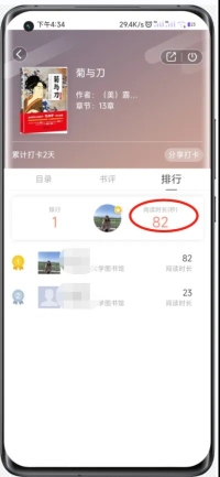 同学进入“阅读电子书活动”模块后,分别点击自己曾经阅读过的书名,在每本书的详细页面中点击“排行”即可查询到该书的阅读时长。