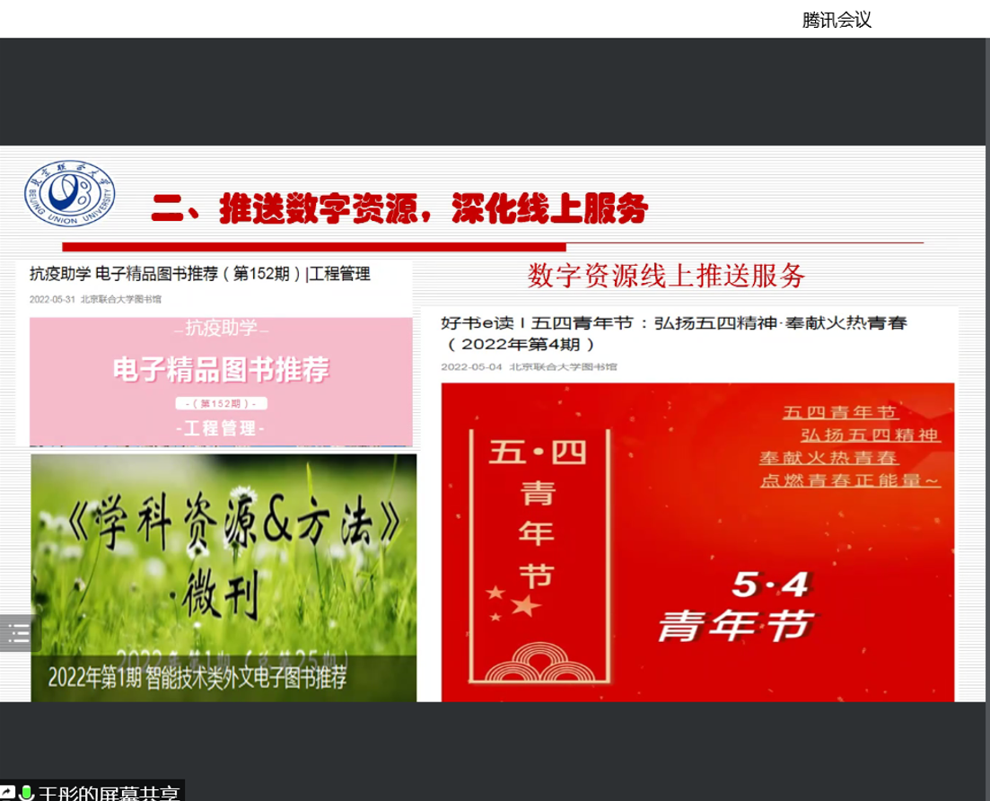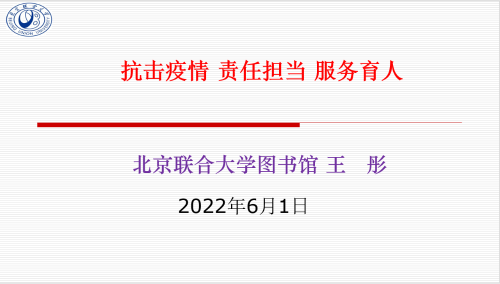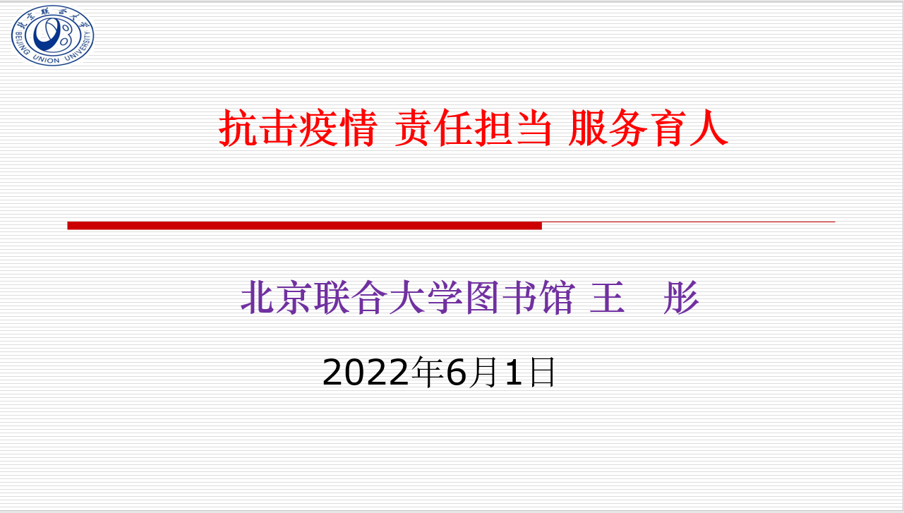 馆长王彤以“抗击疫情 责任担当 服务育人”为题讲话,要求全体馆员要提高政治站位,坚决执行疫情防控政策,不断深化服务。并从“服务传递爱心,助力学生阅读”“推送数字资源,深化线上服务”“组织线上活动,丰富文化生活”“夯实服务基础,提升育人能力”等四个方面对疫情防控期间图书馆开展的服务和文化活动进行了梳理和总结。她提出,图书馆严格落实疫情防控措施,认真执行疫情时期《图书馆管理方案》,为在校师生提供温馨安全的阅览环境,图书馆人文馆疫情时期一直开馆,并在5月11日将开馆时间延长到晚上十点,为在校师生提供借阅服务,确保疫情期间读者服务不间断。图书馆制定了《送书防疫规程》,严格执行借阅图书消杀及相关防疫流程,自5月19日起,推出疫情期间为北四环校区北院在校学生提供预约借书服务,安排住校专人送书,确保在做好疫情防控前提下为住校学生提供服务。疫情时期开展推送数字资源,深化线上服务,发布《抗疫助学 电子精品图书推荐》从73期到152期,按照专题推送电子书籍,包括各个学科领域。在线上教学期间,图书馆与校党委宣传部、校学生处、校团委联合举办品味经典—2022年第六届北京联合大学“书香联大”读书文化节,开展北京联合大学第六届“书香杯”经典诵读大赛及各类读书文化活动,极大丰富了大学生文化生活。
