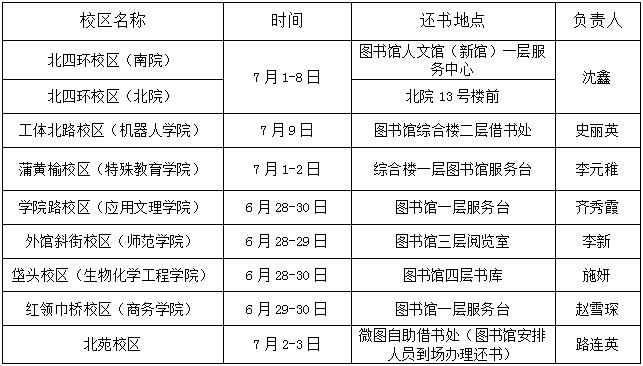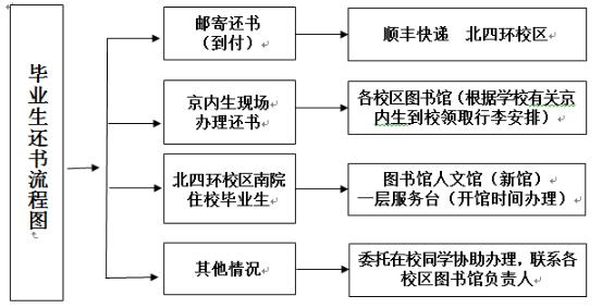 各校区图书馆根据各校区京内毕业生返校安排进行相应调整;图书馆人文馆(新馆)在开馆时间随时办理还书。