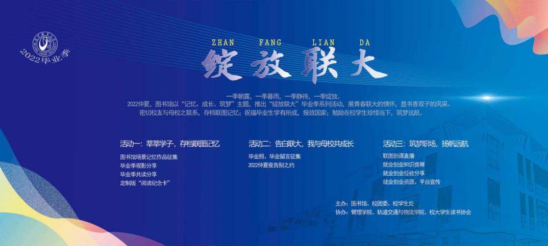 2022年6月-7月,图书馆联合校团委、校学生处围绕“记忆、成长、筑梦” 主题联合开展了2022“绽放联大”毕业季活动,包括“莘莘学子,存档联图记忆”“告白联大,我与母校共成长”“书香联图,助力学子,筑梦职场,扬帆远航”三大系列。活动由管理学院、城市轨道交通与物流学院、校大学生读书协会协办。
