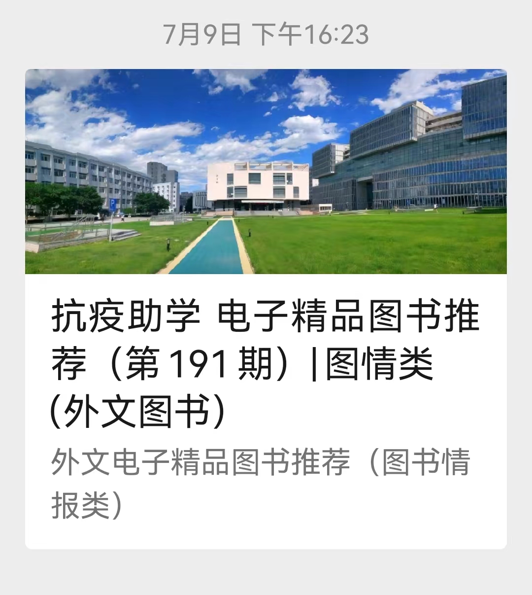 在图书馆党总支带领下,图书馆各部门积极开展学科数字资源线上宣传和服务。以学科为导向,以育人为引领,针对不同学科、专业推送中外文电子图书资源,持续发布《抗疫助学 电子精品图书推荐》到193期。《好书e读》栏目推送人民日报推荐书单,书海泛舟,青春作伴,丰富和充实了大学生暑期文化生活。