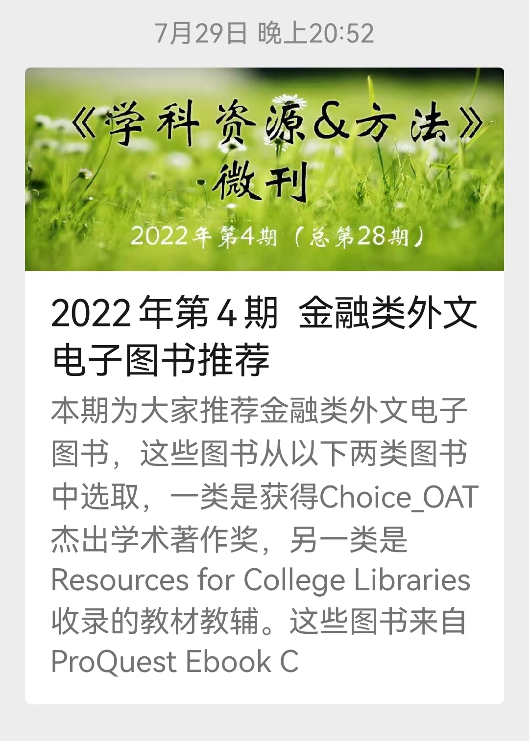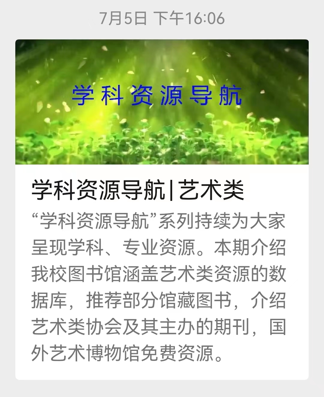 深化学科在线服务,探索服务专业教学和科研新内容。学科服务部推出第28期《学科资源&方法》微刊,介绍了Ebook Central电子书平台和金融类外文电子图书查找方法,推荐Choice_OAT杰出学术著作奖和Resources for College Libraries收录的教材教辅专题外文电子图书。同时疫情期间,学科服务部推出《学科资源导航》和《学科情报订阅》新栏目,丰富拓展在线学科服务形式和内容,提升服务品质和内涵。《学科资源导航》为读者揭示呈现不同学科、专业的图书、期刊、数据库、学协会、会议信息等整合资源导航,方便师生查找和利用学科、专业信息。7月份推出艺术类学科资源导航,介绍了图书馆涵盖艺术类资源的综合性、专业性数据库、馆藏艺术类图书、国内艺术学协会及主办期刊,世界著名艺术博物馆等开放资源。《学科情报订阅》栏目介绍如何免费查找2021版的爱思唯尔CiteScoreTM期刊影响力指标,该指标依托中外文期刊收录最大的平台Scopus数据库资源。