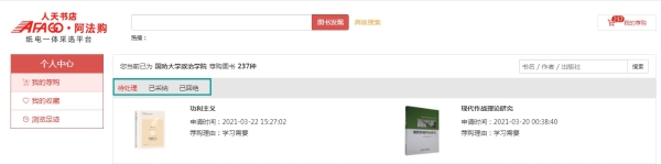 3.馆配电子书:我校读者可选购纸质图书,电子书暂不可购买。