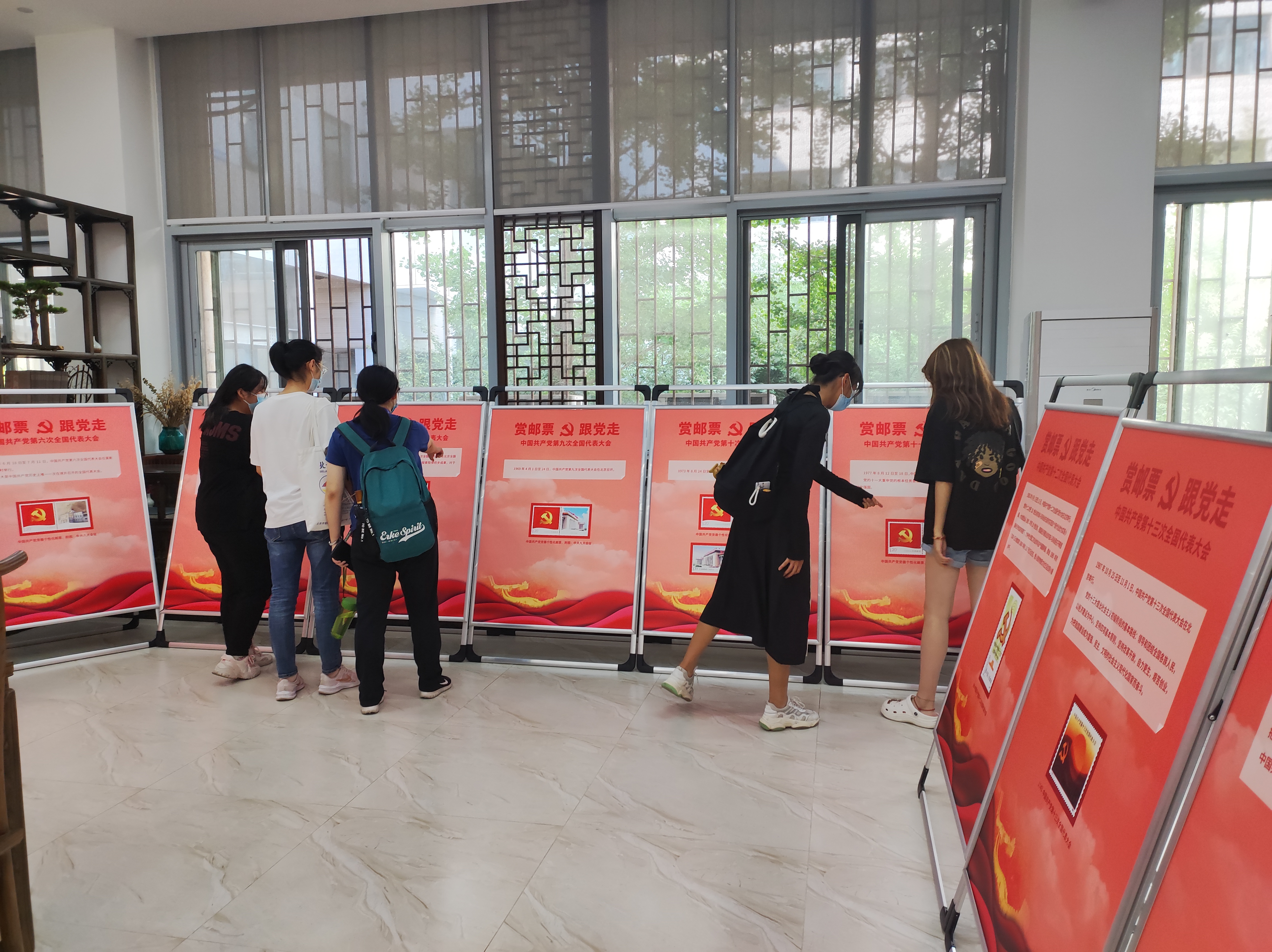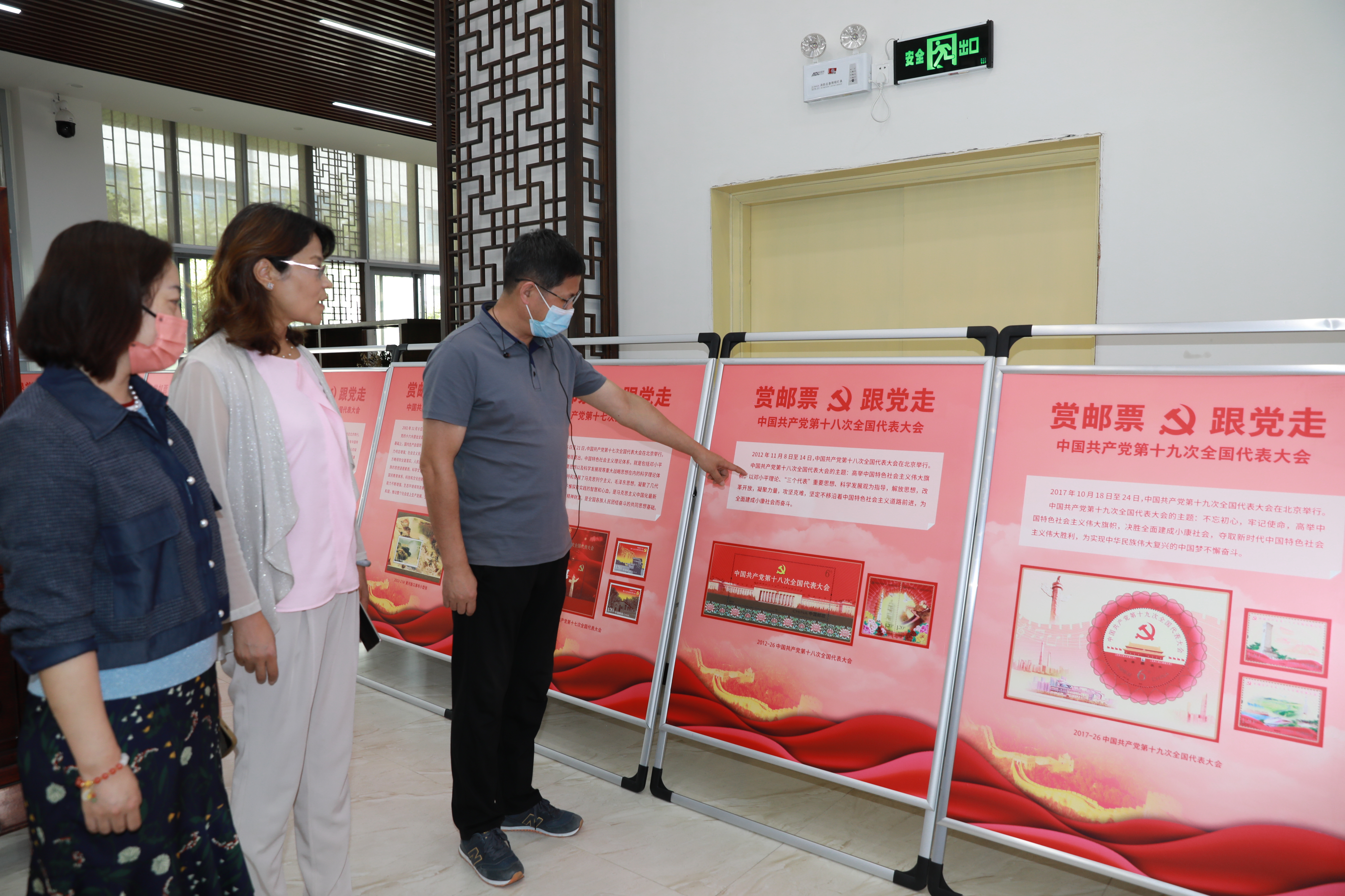 此次展览以邮票为载体,集中展现了中国共产党第一次全国代表大会到第十九次全国代表大会期间发行的党徽个性化邮票和中国共产党历次全国代表大会会址邮票,并详细介绍了每次大会的主题、目标和重要意义。邮展的同时,在人文馆、理工与艺术馆显示屏播放的“赏邮票·跟党走”宣传片,以中国共产党历次全国代表大会为线索,讲述了邮票中的故事,回顾了中国共产党成立以来披荆斩棘、不懈奋斗的光辉历程和重大历史时刻,以及党的十八大以来我国在经济建设、政治建设、文化建设、社会建设和生态文明建设取得的重大成就。