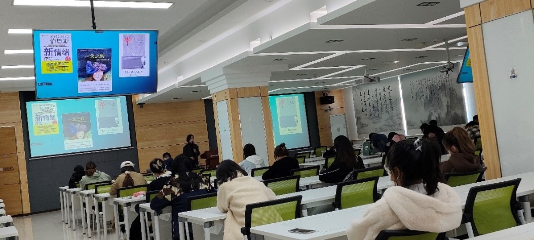 为激发学生阅读兴趣,让学生在阅读中陶冶情操、获取真知,治愈心灵,2022年10月11日下午,图书馆一小时讲座如期进行。本期主题为《读祛心病——讲述阅读疗法的前世今生》,图书馆读者活动部刘婧老师担任主讲,讲座线上线下方式同时进行,校本部50余名学生现场聆听讲座,应用文理学院、生物化学工程学院、师范学院、机器人学院、特殊教育学院、商务学院240余学生通过腾讯会议线上同步收看了讲座。