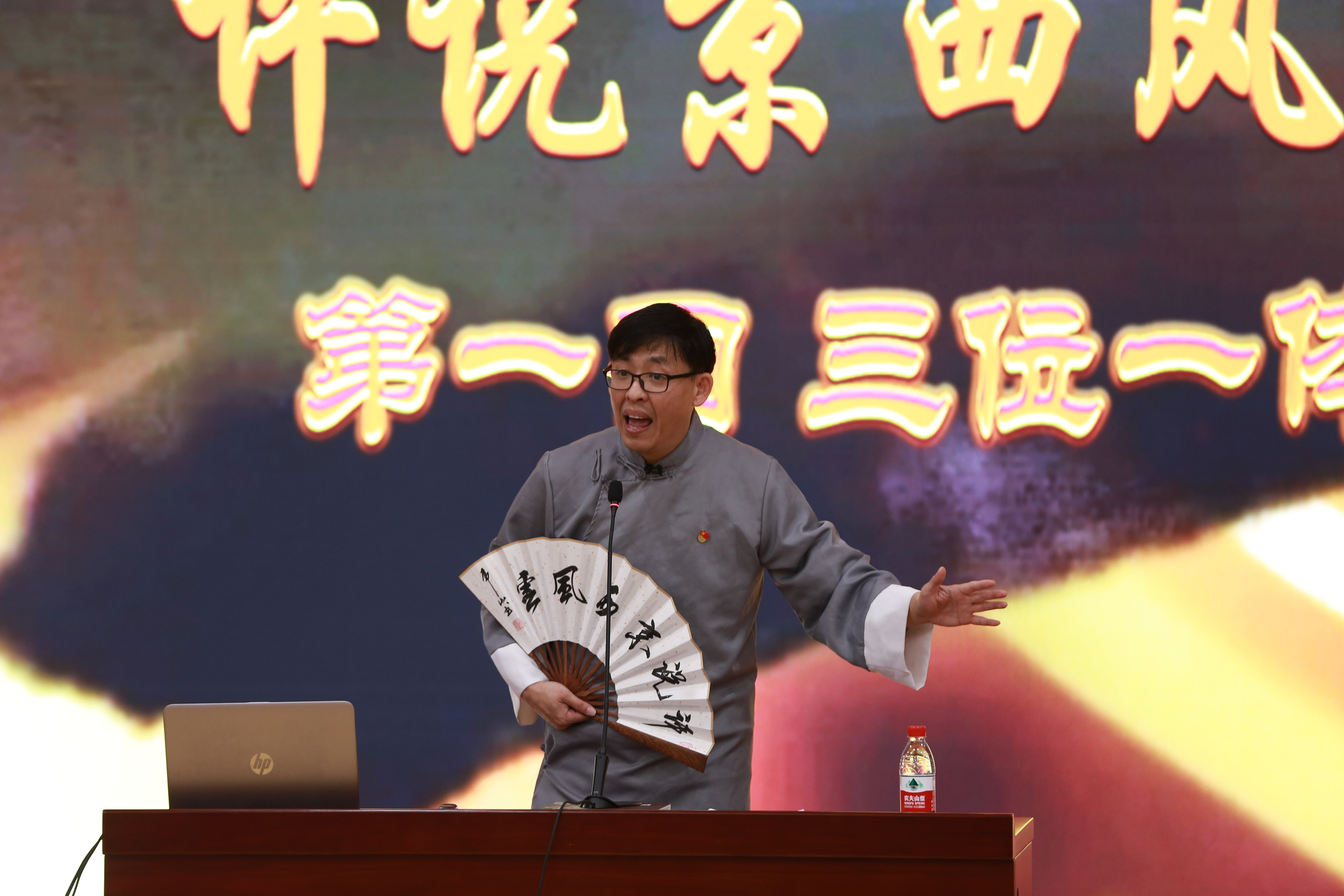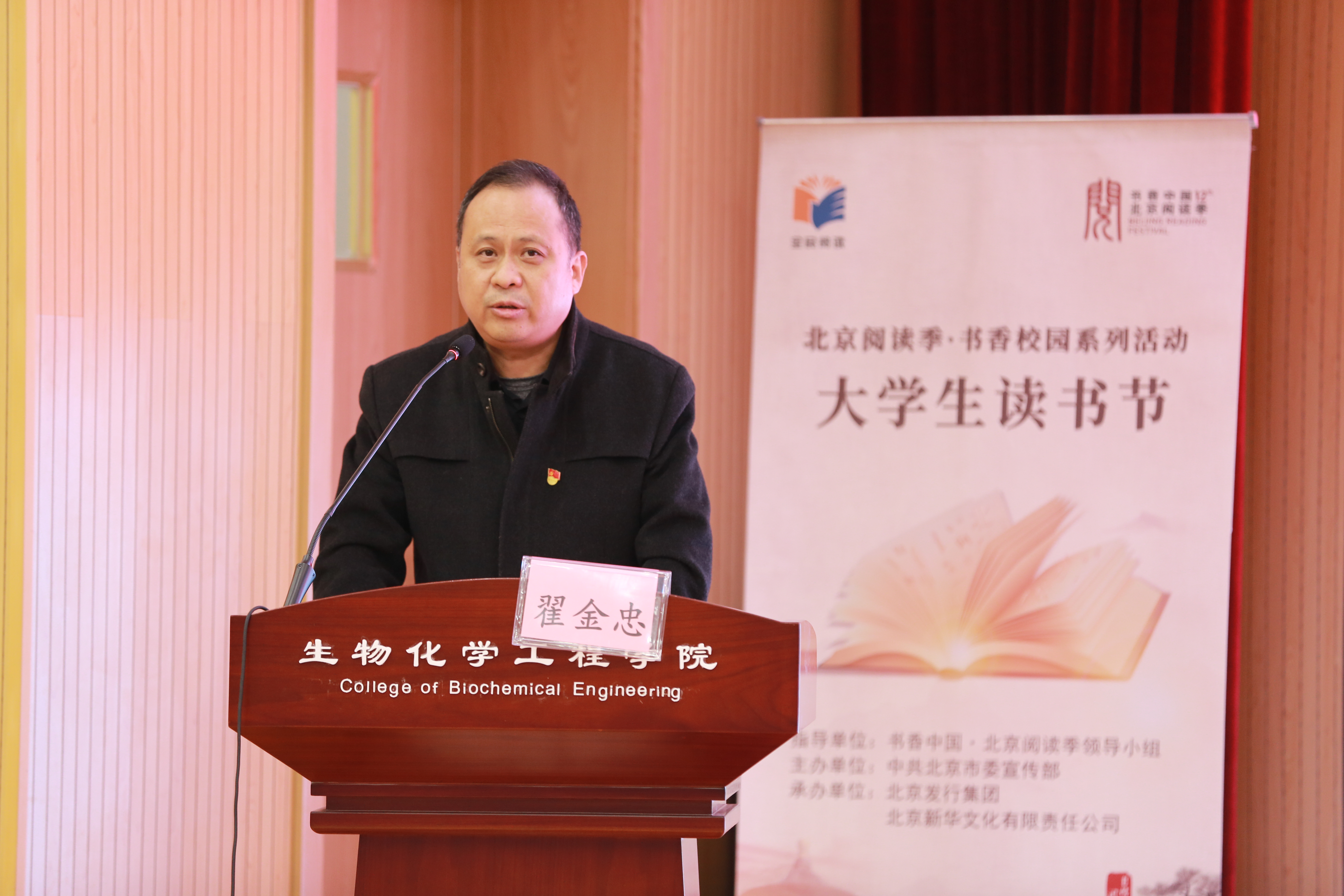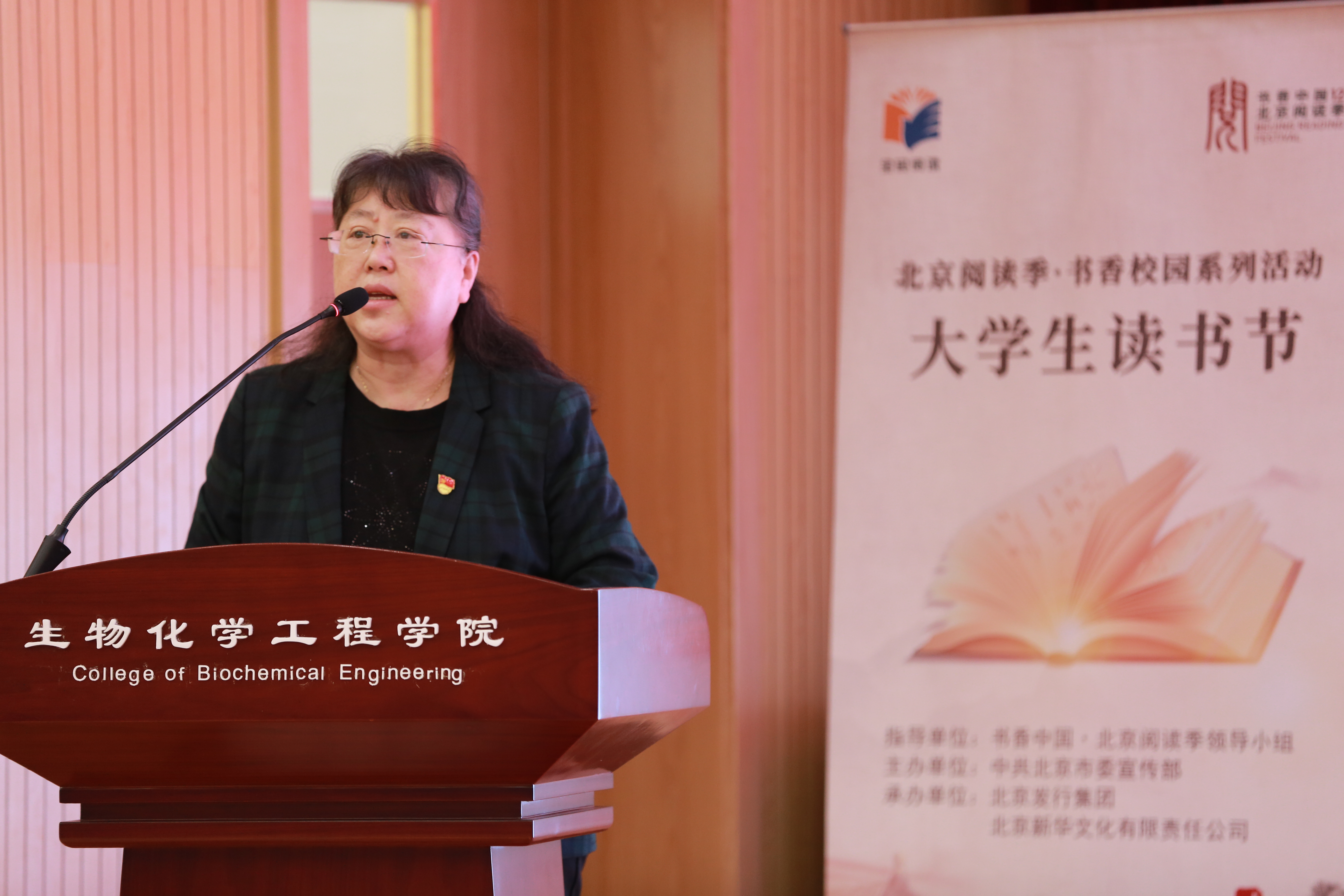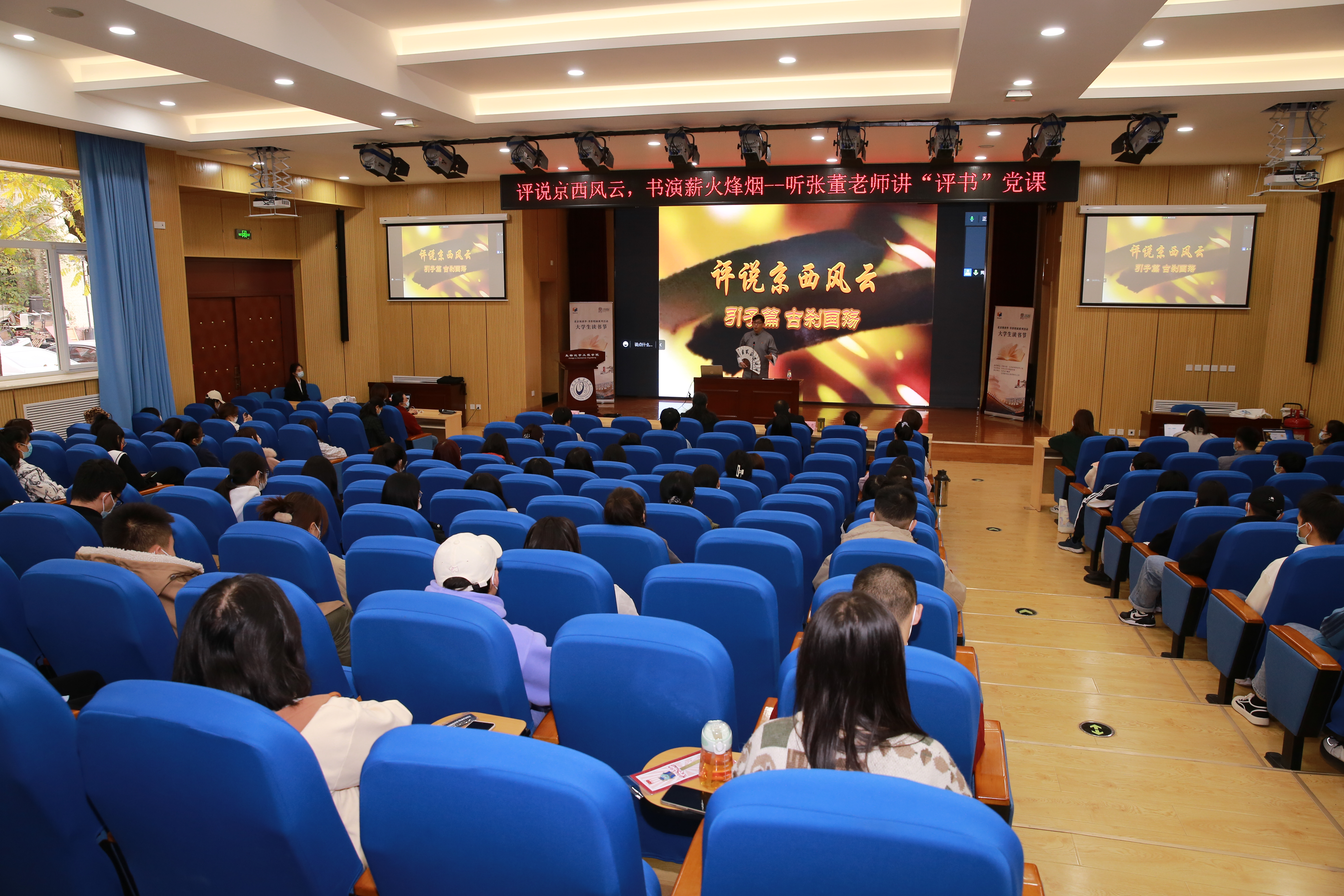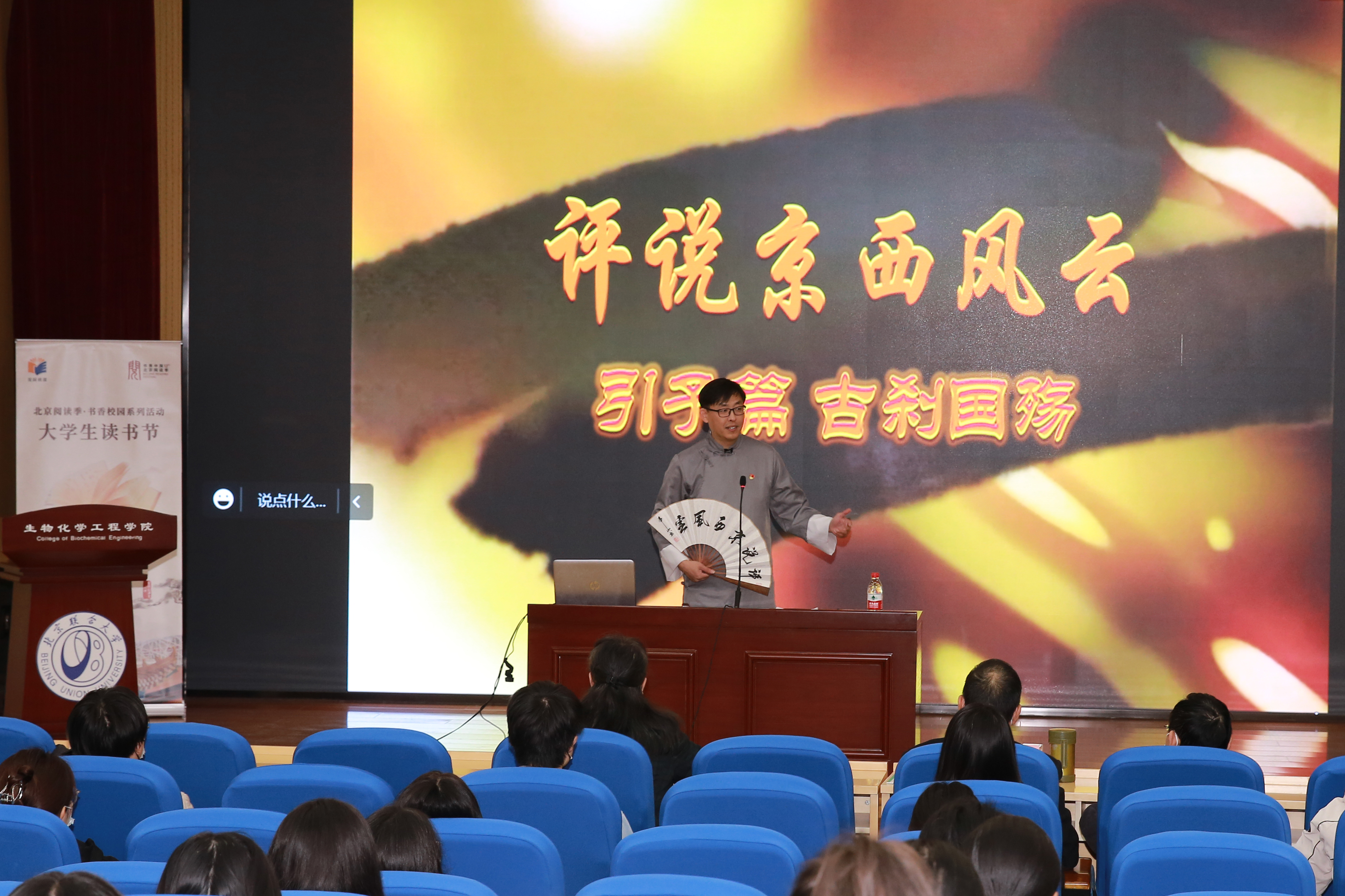 图书馆馆长王彤在致辞中感谢北京阅读季一直以来对我校开展“两节两季”读书文化活动给与的大力支持。感谢生物化学工程学院领导及相关部门对此次评书党课活动的支持。图书馆以习近平新时代中国特色社会主义思想为指导,落实党的教育方针, 落实立德树人根本任务,不断深化“文化育人”“服务育人”,协同校内多部门联合打造“两节两季”文化育人平台,逐渐形成“书香杯”经典诵读大赛、真人图书馆等特色品牌活动, 深化经典阅读,传承红色基因。此次张董老师的评书党课是党史学习教育形式的创新,文化育人内涵的拓展,希望今天这堂“特殊”的党课能够让同学从历史中汲取精神力量,同时激发同学们的爱国热情,坚定理想信念,共筑中国梦!