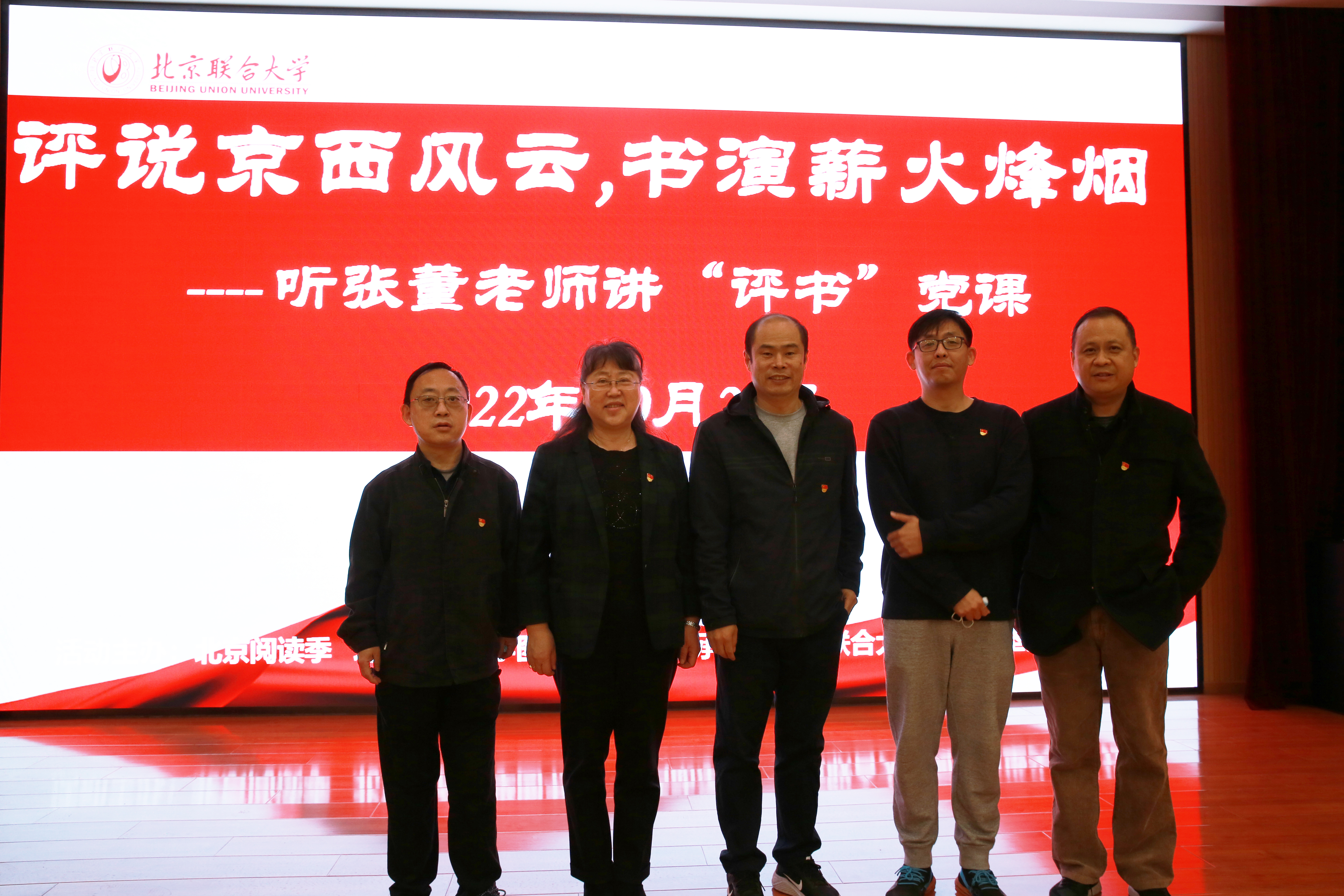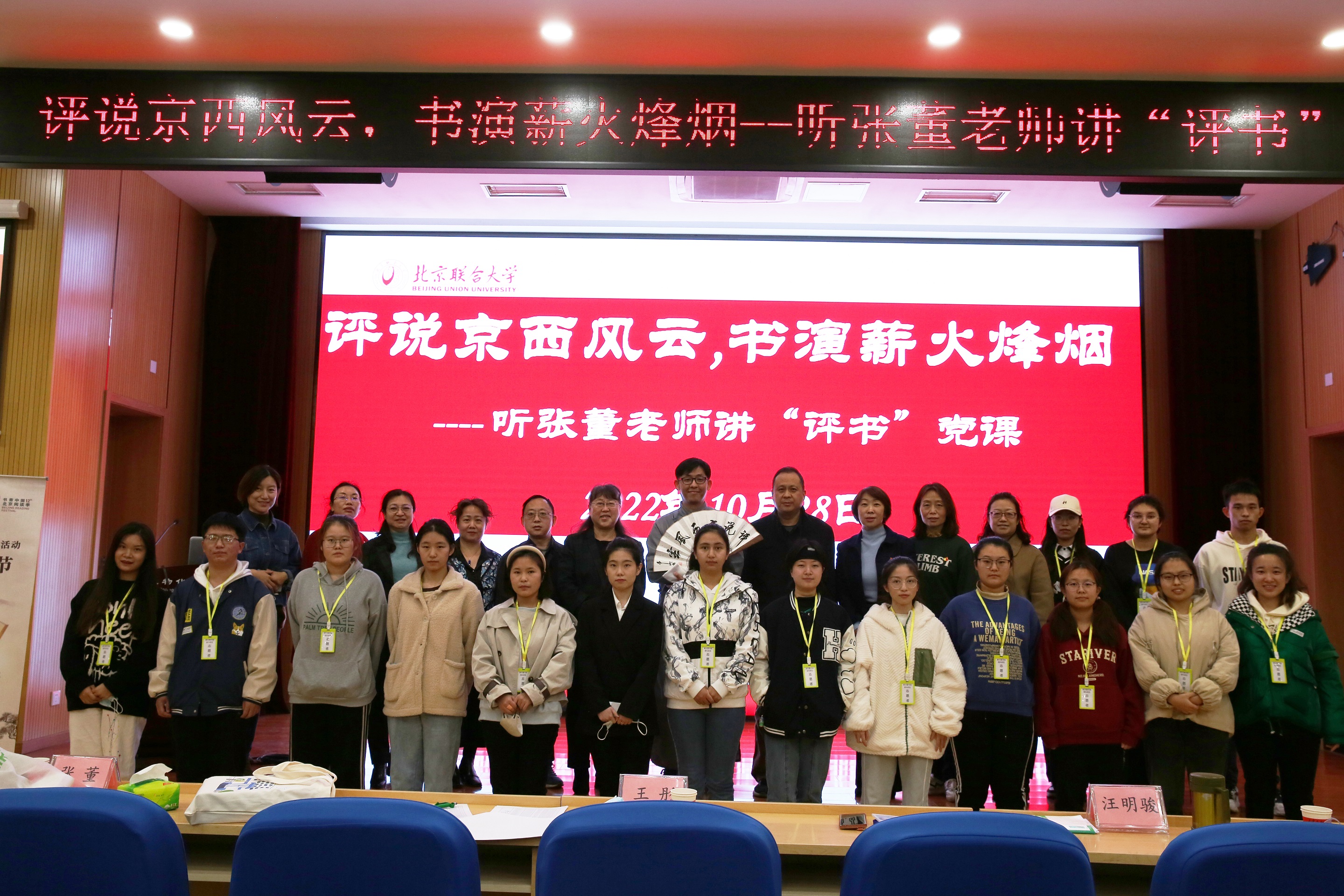 为深入学习党的二十大精神,创新党史学习教育形式,丰富党课教育内涵,让大学生在学习党史知识的同时从红色文化中汲取精神力量,传承红色基因,赓续红色血脉,继承革命传统,激发爱国情怀,图书馆与北京阅读季合作开展“讲党史 跟党走”活动, 2022年10月28日下午邀请门头沟区委党校办公室副主任张董老师在北京联合大学垡头校区以 “评说京西风云,书演薪火烽烟”为题讲授“评书”党课。图书馆党总支书记翟金忠、馆长王彤、副馆长汪明骏,北京阅读季工作人员以及生物化学工程学院、应用科技学院等近120名师生在北京联合大学生物化学工程学院北院报告厅参与了现场活动,200余名大学生观看了活动直播。