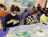 本次活动是图书馆外馆斜街校区分部“传统服饰之美”21天阅读的线下活动之一。在此之前,同学们阅读了《时尚通史》等著作,其中对扎染只提到了非洲的传统扎染,图案多变,颜色艳丽,因此对中国传统扎染充满了期待。活动开始,文献特藏部主任崔婷老师首先向同学们介绍了中国传统扎染的前世今生,所用原材料、图案特色、工艺特点及其传承的重大意义。接着在手工艺技师苑晶晶的带领下,同学们开动脑筋,巧思设计,在洁白的手绢上用夹、扎等方法绘制出心仪的图案,投入染料中,轻轻搅动至均匀上色。20分钟后,在同学们的惊叹声中,传承千年的扎染绽放出生动多姿的美丽画面。