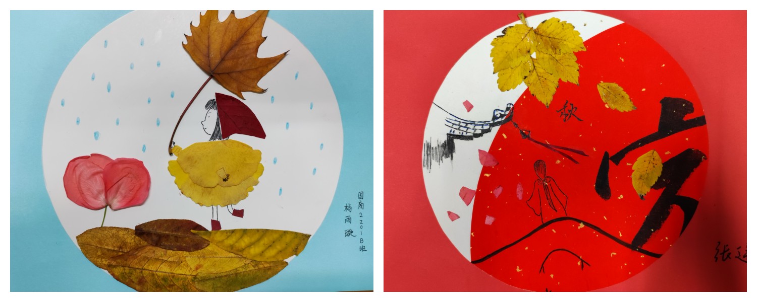 此次活动由图书馆老师共同策划,孟睿老师具体指导。为提升作品的意境和品位,要求同学们以一句诗或者有意境的词语来命题、构思,自由发挥自己的创意和想象,到校园中去搜集树叶、花草、树枝、植物的种子等创作素材,用剪贴、描绘等形式制作成景物画、人物画、动物画,植物画等艺术作品,图书馆老师将作品压膜成型,布置了作品展。