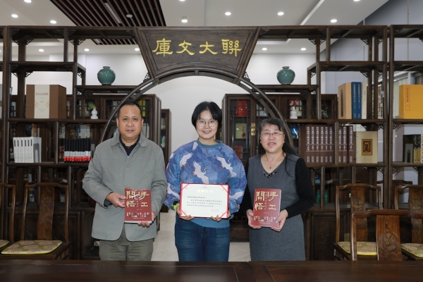 10月19日,在理工与艺术馆一层联大文库举行了捐赠仪式,我校艺术学院工艺美术系杨慧子老师将其长期进行非遗与文创设计的教学、实践、研究成果《手工开悟:非遗与文创设计》著作捐赠给图书馆,党总支书记翟金忠、馆长王彤代表图书馆接受捐赠并颁发了捐赠荣誉证书。