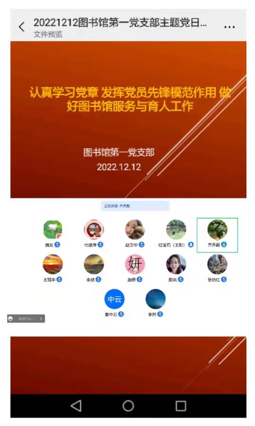 2022年12月12日上午,图书馆第一党支部在腾讯会议线上开展了12月主题党日活动,活动主题是认真学习党章,发挥党员模范作用,做好图书馆服务与育人工作。活动由图书馆第一党支部书记齐秀霞主持,党总支副书记、馆长王彤及支部全体党员参加了活动。