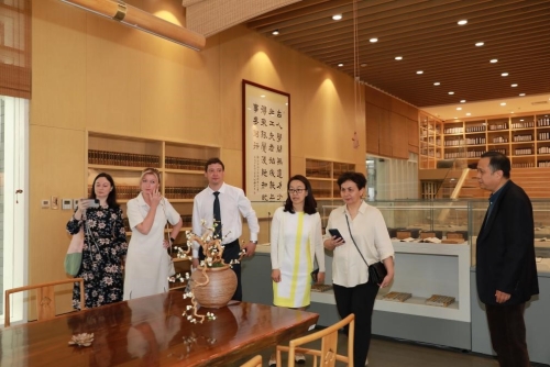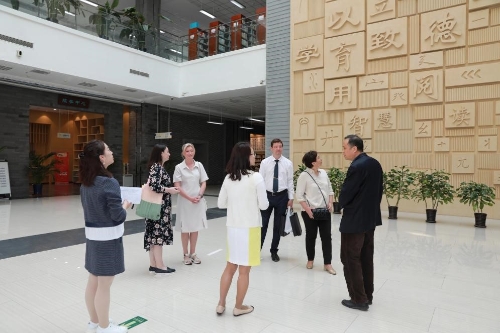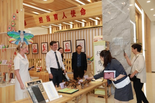 翟金忠对代表团的来访表示热烈欢迎,陪同代表团一行参观了人文馆文化艺术墙、元堃书院、读者之星展墙、藏书阁、手工艺博物馆,理工与艺术馆联大文库、视听室等创意空间,观摩了主题教育图书展、图书馆文化育人实践成果展、中国非遗传统技艺学生实践作品展。介绍了图书馆建筑中融合传统与现代的设计理念、彰显文化底蕴的古籍文献的收藏与保护,以及独具北京传统文化韵味的研讨空间。