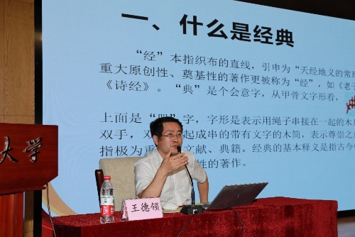 讲座中,王德领教授解释了什么是经典,经典是要经得起重读的。流行的书籍不一定是经典。就文学经典来说,我们经常说的经典大作家,英国的莎士比亚,中国的李白、杜甫,印度的泰戈尔,美国的海明威,意大利的但丁,奥地利的卡夫卡,俄罗斯的普希金、托尔斯泰,他们的作品是经典,占据着人类文明的核心位置,被一代又一代的人阅读,丰富、塑造着一代又一代人的心灵。我们阅读经典能体悟到人类智慧的深邃浩大,提高我们的认知经验和语言表达水平。另一方面,王德领教授从文学批评者的角度,认为网络文学中的盗墓、穿越、宫斗之类的小说具有快餐化、肤浅化特征,提出阅读屏幕的时代,浅阅读只有娱乐功能无法启迪阅读者的人生。